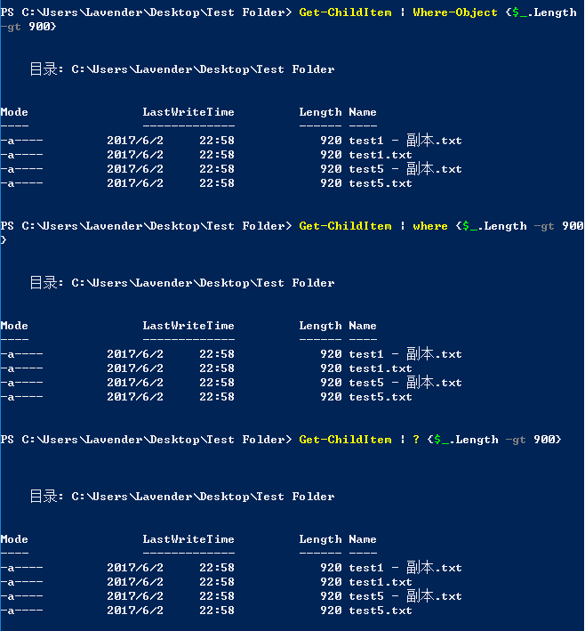 對于輸入的每一項,Where-Object都會根據{}中定義的腳本塊對輸入進行計算,如果返回True,則輸出,否則不輸出。如下例子: