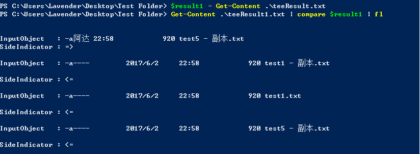 用Compare-Object(別名是compare和diff)可以將兩組對象進行比較,一組對象為Reference組,而另一組為Difference組。比較的結果將指示屬性值是只出現在 Reference 組中的對象中(由 <= 符號指示),或是只出現在 Difference 組中的對象中(由 => 符號指示),抑或(在指定了 IncludeEqual 參數的情況下)同時出現在這兩個對象中(由 == 符號指示)。