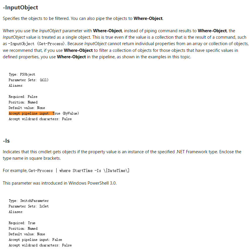 學會使用管道后,得學會判斷一個命令是否支持管道輸入。使用Get-Help命令獲取一個命令的使用方法,對于參數,可以看到是否支持管道輸入,或者通過MSDN去查詢命令幫助。