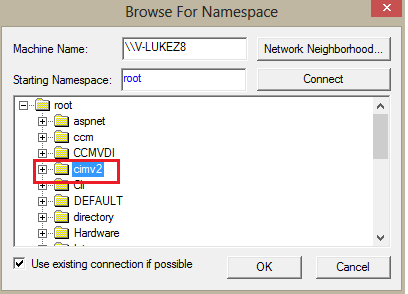 3、選擇合適的命令空間(這里選擇常用的root/cimv2),然后單擊OK按鈕,如圖3所示;
