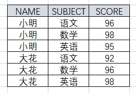 SELECT *FROM studentPIVOT ( SUM(score) FOR subject IN (語文, 數(shù)學(xué), 英語))