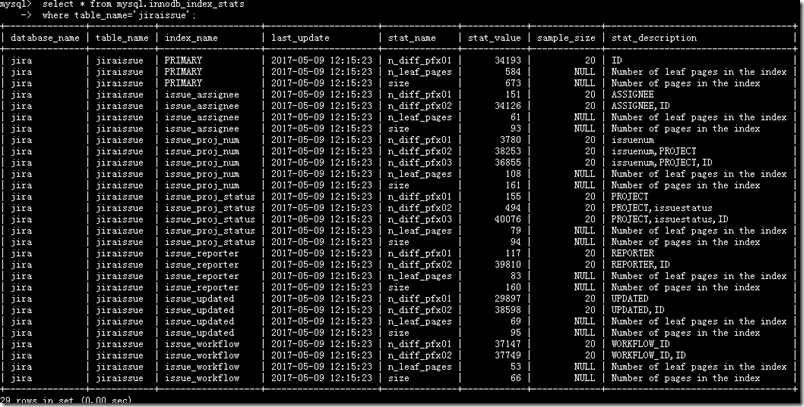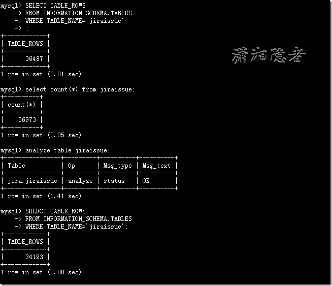 mysql> SELECT TABLE_ROWS -> FROM INFORMATION_SCHEMA.TABLES -> WHERE TABLE_NAME='jiraissue' -> ;+------------+| TABLE_ROWS |+------------+| 36487 |+------------+1 row in set (0.01 sec) mysql> select count(*) from jiraissue;+----------+| count(*) |+----------+| 36973 |+----------+1 row in set (0.05 sec) mysql> analyze table jiraissue;+----------------+---------+----------+----------+| Table | Op | Msg_type | Msg_text |+----------------+---------+----------+----------+| jira.jiraissue | analyze | status | OK |+----------------+---------+----------+----------+1 row in set (1.41 sec) mysql> SELECT TABLE_ROWS -> FROM INFORMATION_SCHEMA.TABLES -> WHERE TABLE_NAME='jiraissue';+------------+| TABLE_ROWS |+------------+| 34193 |+------------+1 row in set (0.00 sec) mysql>