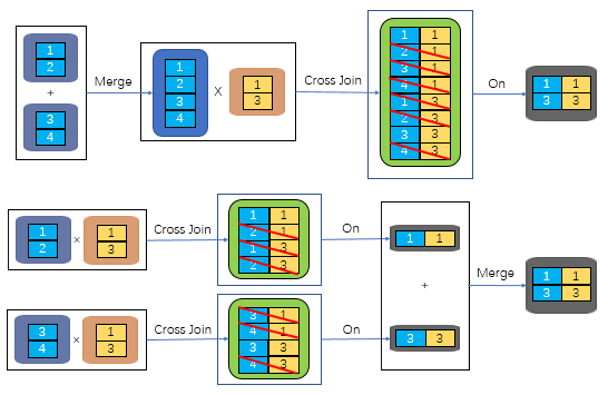 而 join 的連接操作,本質(zhì)上可以視為一種乘法,因為 join 連接等價于 cross join 后再用 on 中條件進行過濾。則根據(jù)乘法分配率可以推導出:若是需要做連接操作的外鍵表(不妨設(shè)為連接右側(cè)的表)在每個庫中都有同一份,則連接左側(cè)的表(每個數(shù)據(jù)庫中各有其一部分)在匯總后再連接,等同于各數(shù)據(jù)中的連接左側(cè)的表與外鍵表先做連接操作后,再匯總到一起的結(jié)果。如圖所示: