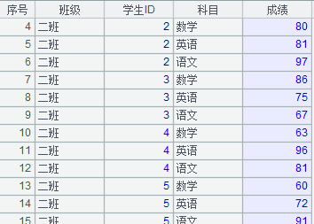 假設(shè)我們想分別求一、二班的數(shù)學總分、人數(shù)、平均分、最高及最低分,單數(shù)據(jù)庫如下:
