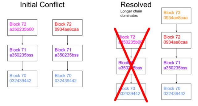 任何時候在鏈中都應該只有一組明確的塊。萬一沖突了(例如:兩個結點都生成了72號塊時),會選擇有最大數目的塊的鏈。