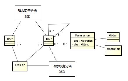 在RBAC之中,包含用戶users(USERS)、角色roles(ROLES)、目標objects(OBS)、操作operations(OPS)、許可權permissions(PRMS)五個基本數據元素,此模型指明用戶、角色、訪問權限和會話之間的關系。
