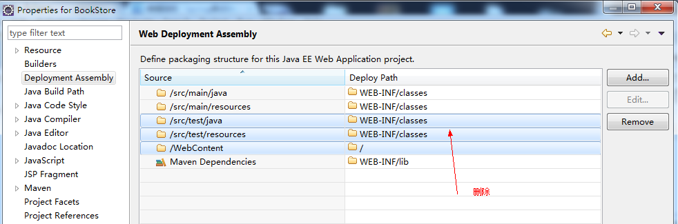1.3、修改項(xiàng)目的部署內(nèi)容。項(xiàng)目上右鍵屬性,選擇“Deplyment Assembly”,刪除不需要發(fā)布的內(nèi)容如:帶“test”的兩個(gè)目錄,WebContent目錄,再添加一個(gè)main下的webapp目錄。