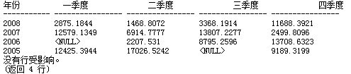 SELECT year as 年份, Q1 as 一季度, Q2 as 二季度, Q3 as 三季度, Q4 as 四季度 FROM SalesByQuarter PIVOT (SUM (amount) FOR quarter IN (Q1, Q2, Q3, Q4) ) AS P ORDER BY YEAR DESC