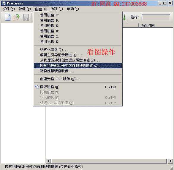 從武林網下載軟件以后,打開winImage.exe,然后 磁盤>恢復物理驅動器中的虛擬硬盤映像