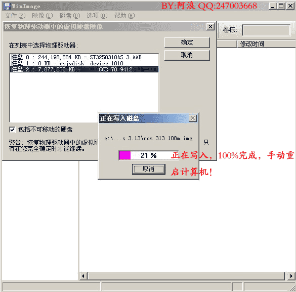 4、出現提示框,認真看好,是自己要寫入的目標磁盤。是!等等會,寫完重啟,OK了。