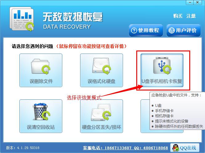 第二步:打開無敵數(shù)據(jù)恢復(fù)軟件,用戶可以根據(jù)需求選擇相應(yīng)的恢復(fù)模式,這里我們應(yīng)該選擇“U盤手機(jī)相機(jī)卡恢復(fù)”恢復(fù)模式,軟件自動(dòng)進(jìn)入下一步。