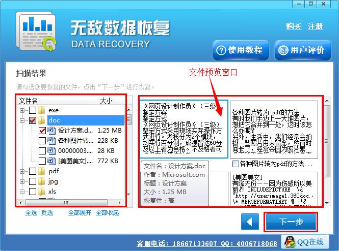 第五步:掃描結(jié)束后,無敵數(shù)據(jù)恢復(fù)軟件會(huì)將掃描到的文件整理并列出,用戶可以通過文件預(yù)覽來找到需要恢復(fù)的文件。選擇需要恢復(fù)的文件,然后點(diǎn)擊“下一步”。