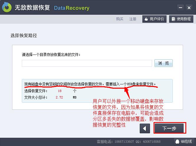 步驟6:選擇文件存放的目錄。因?yàn)槭腔謴?fù)重新分區(qū)所丟失的數(shù)據(jù),所以用戶(hù)最好外接一個(gè)硬盤(pán)保存恢復(fù)的數(shù)據(jù),以防造成數(shù)據(jù)覆蓋問(wèn)題。然后點(diǎn)擊下一步,等待恢復(fù)完成。