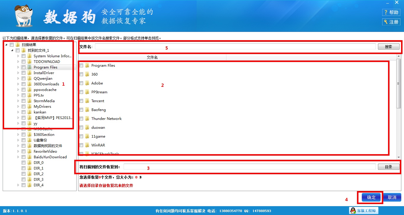 第四步:待掃描完成后,軟件自動進入“恢復文件選擇界面”,如下圖所示。如果您想要恢復移動硬盤里的所有資料,那么請在區域1內的菜單欄中選中所有文件夾;如果您只需要恢復移動硬盤里的部分資料,您可以在區域1內選中您需要恢復的文件原存放的文件夾,然后再區域2內找到并選中您需要恢復的文件,您也可以嘗試使用區域5內的搜索功能,直接將您需要的文件顯示在區域2內。找到您需要的文件后,單擊文件名還可以對文件進行預覽。接著,在區域3內選擇文件恢復后的保存路徑,為保證恢復成功,請勿將恢復數據的保存位置設置為您格式化的移動硬盤。完成上述步驟后點擊區域5內的確定。