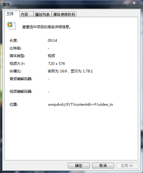 放入光盤,自動會啟動Windows media player軟件播放,這是后,點擊菜單中的“文件”下面的“屬性”,可以看到下面這個面板。特別是位置的那部分,暴露了視頻的路徑:“F:/video_te”。對,視頻就在這個目錄。