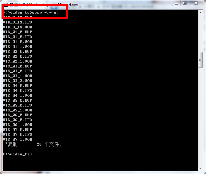 開始菜單,運行“CMD”進入DOS命令行,先進入“F:”盤,然后進入“F:/video_te”目錄,在把這個目錄下的所有文件復制到E盤(硬盤)具體方法如下: