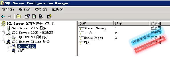 2.在SQLSERVER2005---配置工具----SQL Server Configuration Manager―SQL2005網(wǎng)絡(luò)配置--MSSQLSERVER的協(xié)議下,啟用TCP/IP協(xié)議,并重啟SQLSERVER的所有服務(wù)