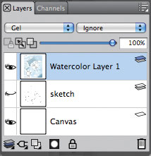 “圖層”面板中顯示的活動水彩圖層。 素描圖層已經被隱藏起來。