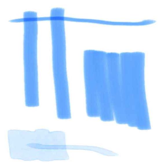 “仿真平筆”變體使您能夠根據蠟版筆的握持方式畫出粗細不同的線條。 如插圖中所示,用此類畫筆所畫筆觸的末尾都帶有精細的鬃毛標記。 “仿真濕性平筆邊緣”畫筆變體可以沿著筆觸邊緣畫出較淡色彩和濃重色彩。 “仿真濕性薄平筆”可以在基于現有作品進行繪畫時方便您取色。