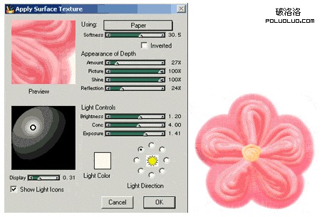 6、新建一個層,改變顏色為粉紅色,改變筆刷尺寸,在花的后面畫 選擇apply lighting ,選擇blue light,改變顏色為粉紅色 。