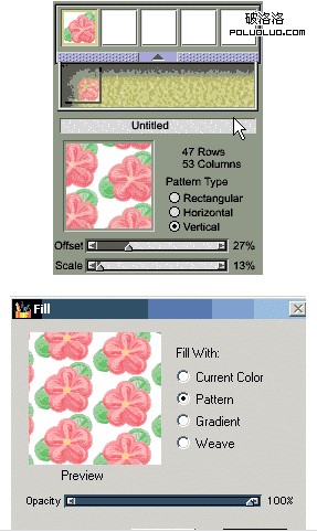 13、打開new pattern library,選擇the new pattern,調節offset到27%,Scale到13%. 選擇canvas層,按ctrl+f打開填充對話框,選擇圖案。
