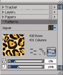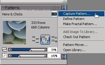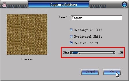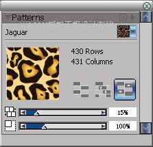 4.在捕獲圖案的對(duì)話框中選擇圖案排列的方式和相關(guān)的百分比數(shù)值,命名為Jaguar保存新圖案。新捕獲的圖案馬上就會(huì)出現(xiàn)在Patterns面板上。