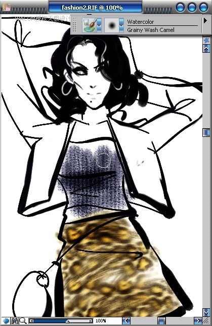 8.使用Ribbed Pastel的紙紋,配合Watercolor/Grainy Wash Camel的筆刷在水彩圖層上進(jìn)行毛衣質(zhì)感的繪制。