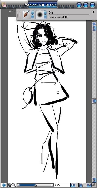 6.先繪制草圖,然后新建一層,設(shè)為Gel的混合模式,命名為“線稿”。使用Oils/Fine Camel 10的筆刷進(jìn)行再描繪。因?yàn)镕ine Camel 10的筆刷設(shè)置了較小的Min Size數(shù)值,因此筆尖可以根據(jù)運(yùn)筆的壓感變化而變化線條筆觸的粗細(xì)。Intuos 3出色的握筆手感和流暢的壓力感應(yīng)可以畫出富有變化的線稿。