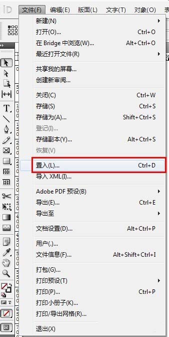 6、 一般排版我們最常用到的是“寫(xiě)字”和“插圖”兩個(gè)功能,下面簡(jiǎn)單介紹一下這兩個(gè)功能。首先是插入圖片,這里你必須要事先把圖片準(zhǔn)備好,有一點(diǎn)好處就是ID支持的文件格式非常多,連PS的源文件都支持直接插入。左上角“文件”-“置入”。