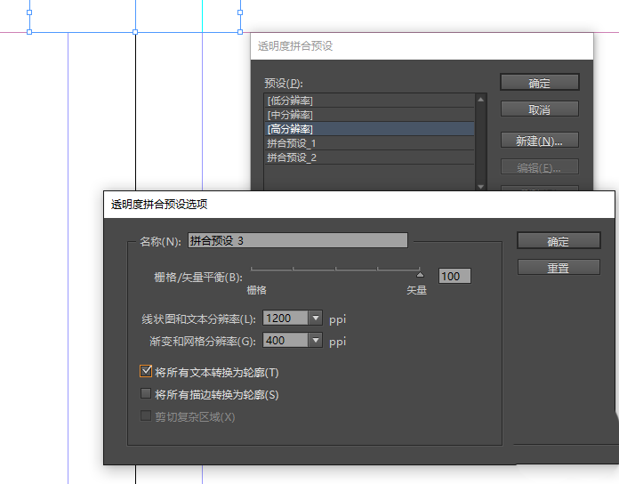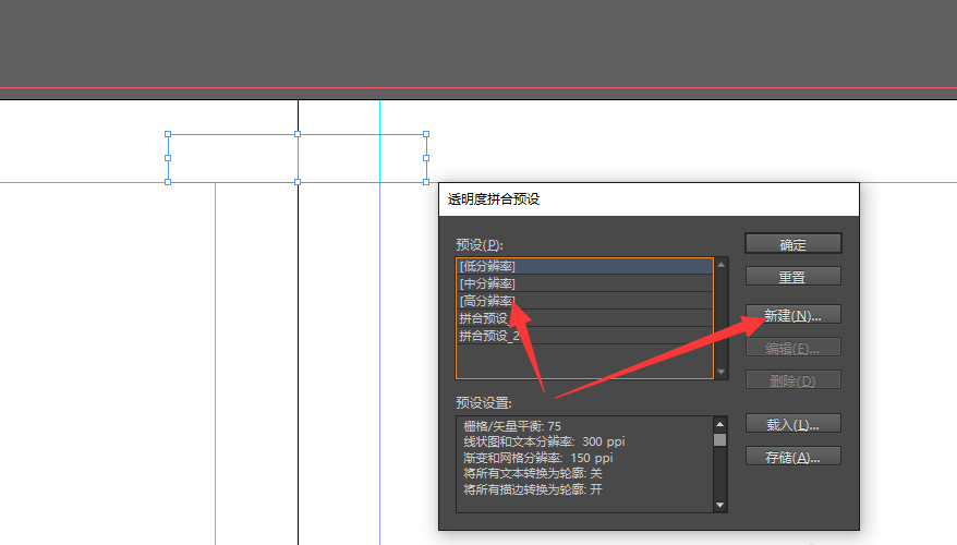 5、同時選取兩個透明度板塊,點擊編輯-透明度拼合預(yù)設(shè)-選擇高分辨率-新建(注意小編箭頭所指的方向哈),將會彈出一個預(yù)設(shè)的頁面框,勾選將所有文本轉(zhuǎn)化為輪廓,其他數(shù)值均選擇最大值。預(yù)設(shè)就這這樣完成,別急還有著。