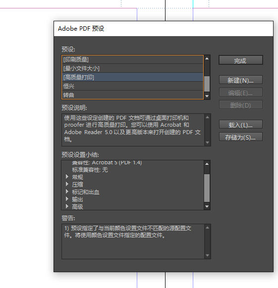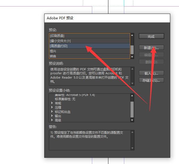 6、現(xiàn)在我們要來設(shè)置一下PDF預(yù)設(shè)了,點擊文件-導(dǎo)出PDF預(yù)設(shè)-高質(zhì)量打印-新建(注意小編所指的方向哈)