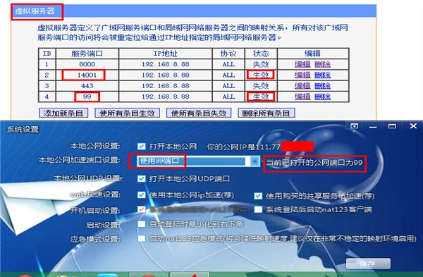 14001是程序的端口,99是加速度端口.我做過測試,只需要映射這兩個端口就行。路由映射使用ALL協議和TCP協議都可以。同時,在nat123系統設置,打開本地公網和本地公網端口。