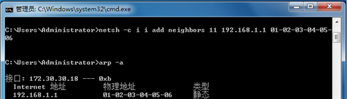 2、查詢到網(wǎng)卡idx編號(hào)后,再使用命令 netsh –c i i add neighbors idx ip mac進(jìn)行ARP綁定,如下: