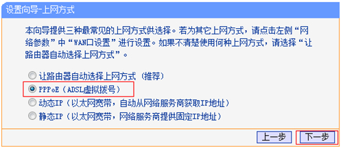 上網(wǎng)方式選擇 PPPoE(ADSL虛擬撥號(hào)),點(diǎn)擊 下一步。