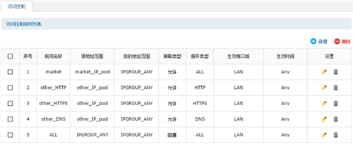 點擊“安全管理>訪問控制”,點擊+新增,添加策略規則:允許市場部訪問所有網絡應用,如下圖所示:
