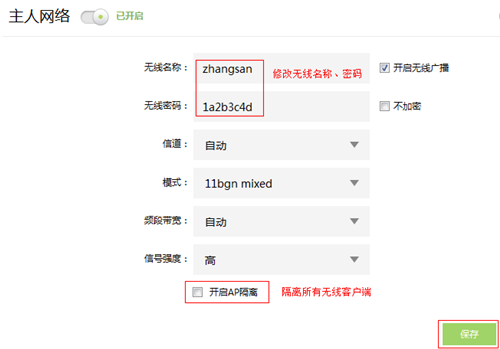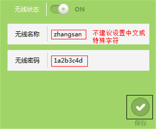 2、修改無線名稱以及無線密碼,點擊 保存,設置立即生效。如下圖: