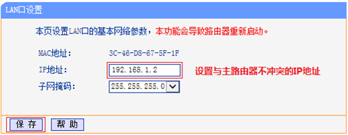 在 網(wǎng)絡(luò)參數(shù) >> LAN口設(shè)置,修改IP地址和主路由器不相同(建議設(shè)置IP地址與主路由同一網(wǎng)段)。設(shè)置完成點擊 保存。