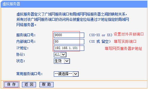 填寫郵件服務(wù)器的服務(wù)端口號(對外開放端口)、內(nèi)部端口號(服務(wù)器實際端口)、服務(wù)器IP地址,然后點擊 保存。