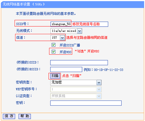 使用修改后的IP地址登錄路由器管理界面,點擊 無線設置5GHz >> 無線基本設置,修改與主路由器相同的SSID號 及 信道,勾選 開啟WDS,點擊 掃描。