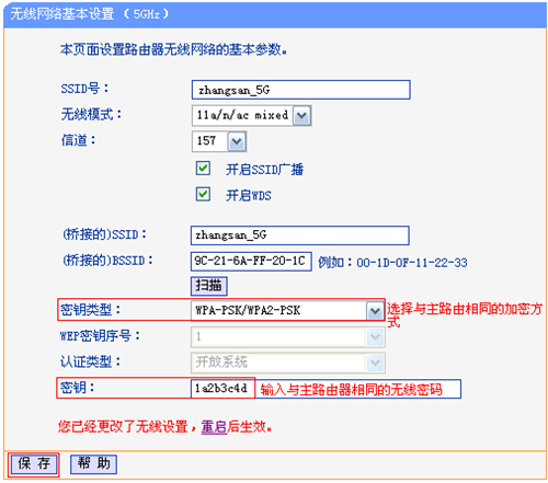 密鑰類型選擇與主路由器相同的 加密方式,在 密鑰 位置輸入主路由器的無線密碼,完成后點擊 保存。無需重啟路由器,繼續下一步設置。