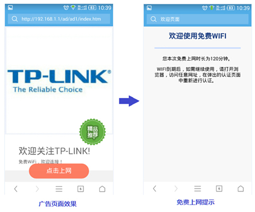 5、體驗廣告效果:使用無線終端連接廣告無線網絡的無線信號,無線連接成功后就會自動彈出廣告。廣告倒計時結束后會出現點擊上網按鈕,如下圖。