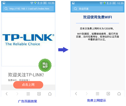 6、廣告效果體驗:使用無線終端連接廣告無線網絡的無線信號,無線連接成功后就會自動彈出廣告。廣告倒計時結束后會出現點擊上網按鈕,如下圖。