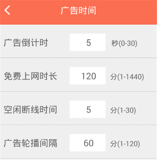 免費上網時間:觀看一次廣告后可以持續的上網時間,超過該時間限制后頁面會再次彈出廣告。