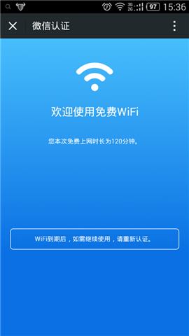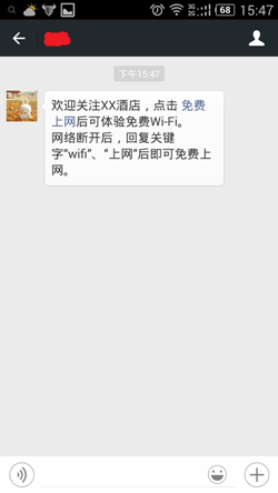 如果下次需要接入該無線網絡上網,請在該微信公眾號中輸入包含“上網”的相關詞語(如“上網”“WiFi”等),收到免費上網消息后,點擊后即可上網。具體相關詞可以在微信后臺設置。