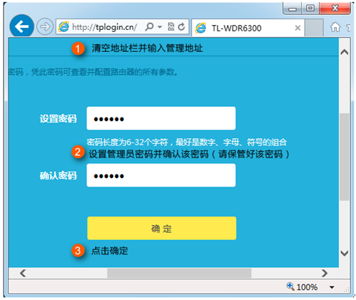 2、打開電腦的瀏覽器,清空地址欄并輸入路由器的管理地址tplogin.cn,在彈出的設(shè)置管理密碼界面中,設(shè)置6~15位的管理密碼,點(diǎn)擊“確定”,登錄路由器管理界面。請(qǐng)記住設(shè)置好的管理密碼,用于后續(xù)管理路由器。