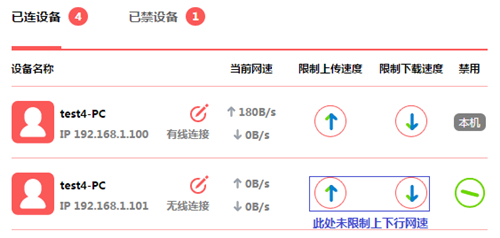 主路由器限制了終端的網速,會影響到終端設備的網速測試。請在測速時,確認主路由器未限制終端網速,如下圖: