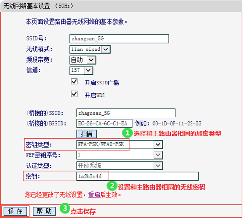 選擇與主路由器相同的 密鑰類型,在 密鑰 位置輸入主路由器的無線密碼,點擊 保存。