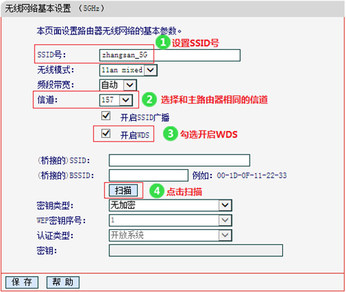 使用修改后的IP地址登錄路由器管理界面,點擊 無線設置5GHz >> 基本設置,設置與主路由器相同的 SSID 號及 信道,勾選 開啟WDS,點擊 掃描。