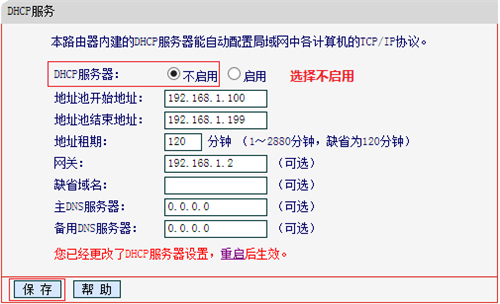點擊 DHCP服務器 >> DHCP服務設置,DHCP服務器 選擇 不啟用,點擊 保存 并重啟路由器。