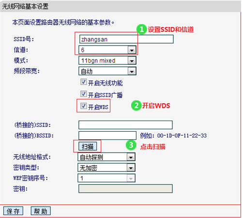 使用修改后的IP地址登錄路由器管理界面,點擊 無線設置 >> 無線基本設置,設置與主路由器相同的 SSID 號及 信道,勾選 開啟WDS,點擊 掃描。